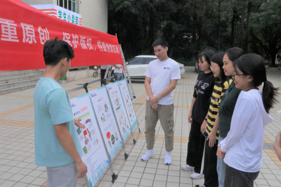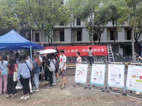 本次活动由“小礼品+宣传”组成。礼品由东莞知识产权研究会提供,同学们主要的任务是派发“尊重原创,保护版权,构建创新松湖”的宣传手册,并与到场的同学们讲解“什么是知识产权”、“保护版权的重要性”、“尊重原创的重要意义”等等。此外,活动还组织了同学们在宣传横幅上签名的环节,旨在通过这个举动强化同学们对“保护知识产权”这个立场的认同,潜意识里做出符合这个观点、立场的行为。
