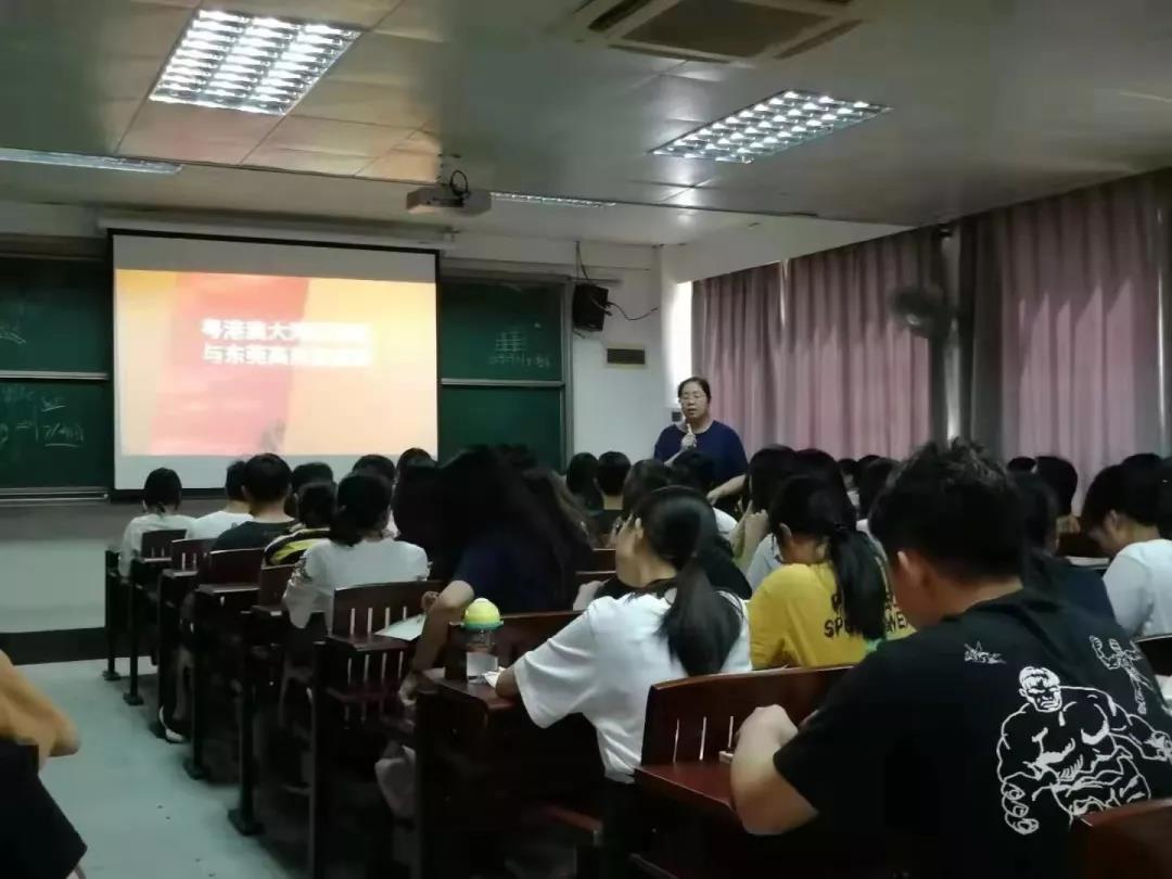 课堂伊始,郑院长便以幽默风趣的语言吸引同学聆听,从本校未来建设和本院整体情况切入,首先对粤港澳大湾区的由来、概述、规划及东莞发展进行了深入浅出的介绍。其中,重点介绍了东莞在粤港澳大湾区建设中的种种发展优势——得天独厚的地理环境、名列前茅的发展潜力、良好的制造业基础等,结合了东莞与大湾区中其他城市的发展关联及各自定位,并以东莞东城街道为实例,娓娓道来,给予同学们谆谆教导。
