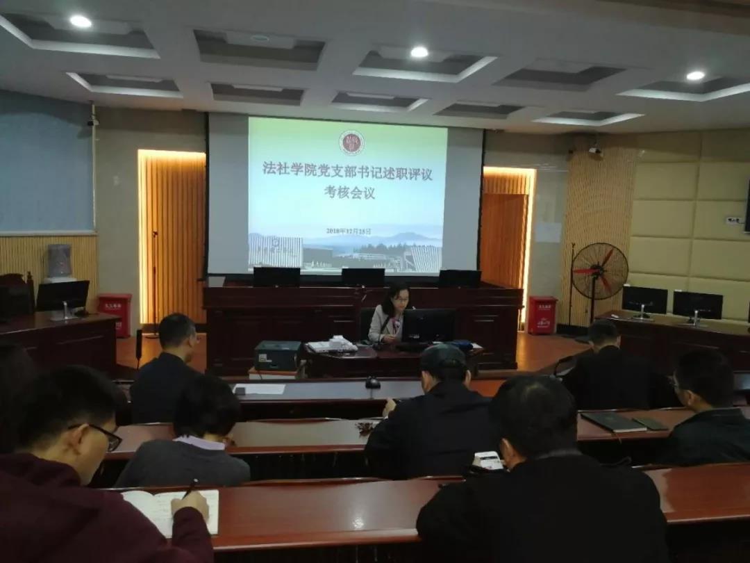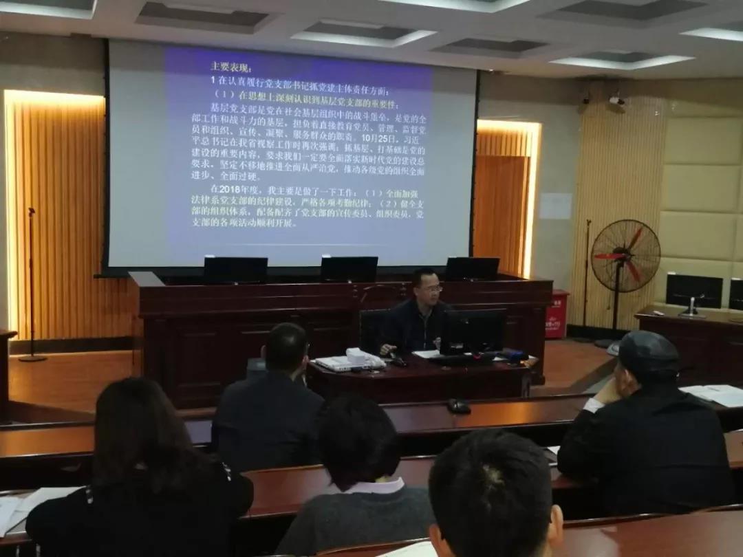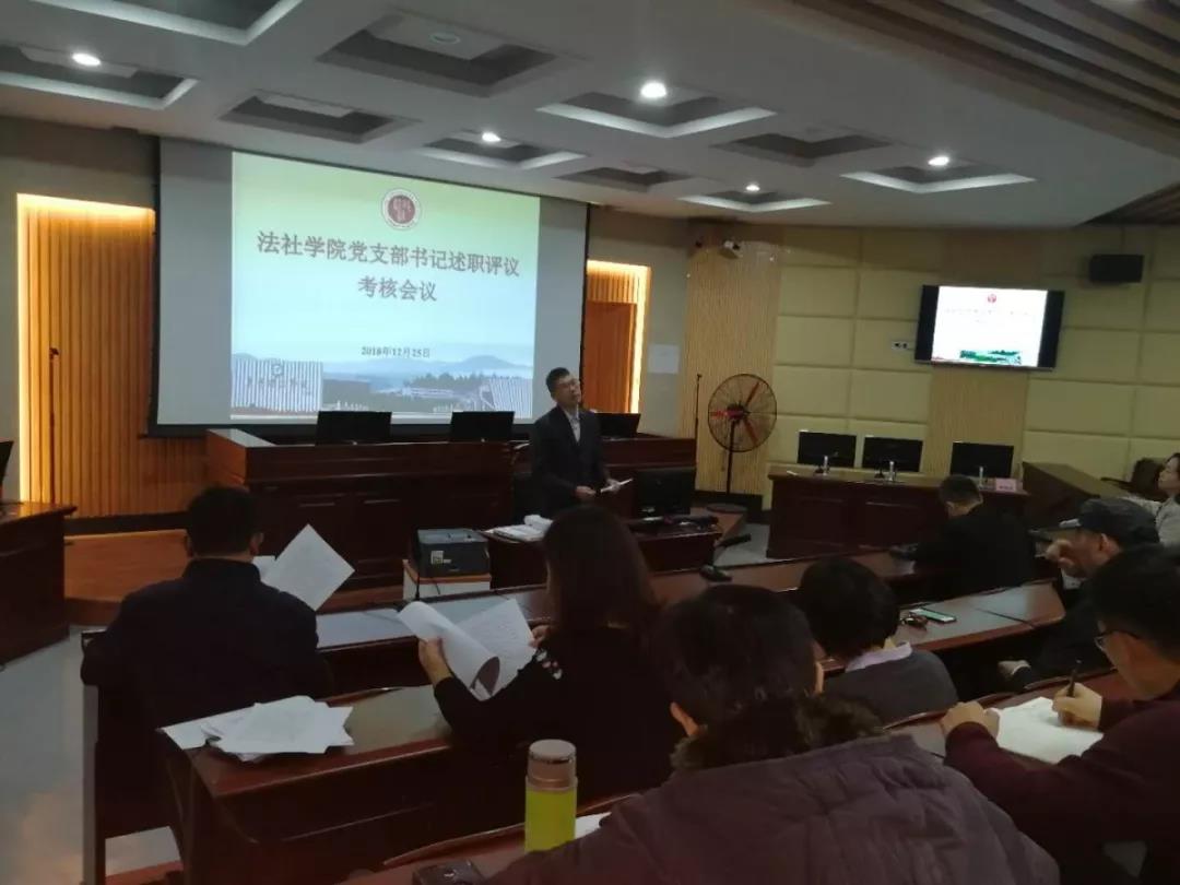 2月25日下午2点30分,法律与社会工作学院为深入贯彻落实习近平新时代中国特色社会主义思想和党的十九大精神,根据《中国共产党支部工作条例(试行)》和《sunbet申搏加强党的基层组织建设三年行动计划(2018-2020)》有关规定,在模拟法庭召开2018年度基层党支部述职评议考核会议。会议由党总支书记潘荣新主持,总支委员、非委员中层领导干部、专职组织员、各支部委员、师生党员代表参加会议。