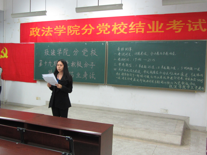 本次分党校考试形式还是与往常一样,采用闭卷。试题有单项选择题、多项选择题、判断题三种题型。考试目的主要是考察积极分子们通过三次分党校入党积极分子培训课与日常学习生活对党的章程以及其他关于党的知识的了解程度。开考时间一到,两校区的党建办工作人员先宣读考试注意事项,然后分发试卷。考试过程中,同学们埋头认真做试题,争取交上一份令自己、令党满意的答卷。两个考场的纪律都很好,无违纪现象。