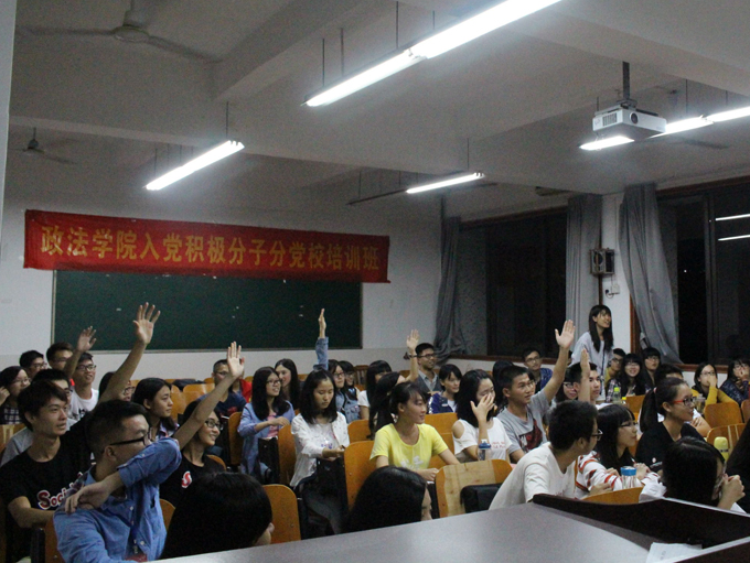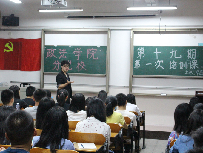 11月24日晚上七点三十分,政法学院分党校第十九期第一次入党积极分子培训课于莞城校区课室1308举行。本次培训课由政法学院辅导员邓磊老师主讲,应到人数为62人,实到人数为56人。