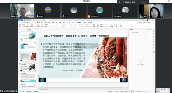沈亚萍以“要营造市场化、法治化、国际化一流营商环境”为题做了辅导报告。她指出,党的二十大报告强调优化民营企业发展环境,依法保护民营企业产权和企业家权益,促进民营经济发展壮大。她从我国营商环境改革过去取得的成效,未来的发展目标以及高校教师在未来的营商中需要发挥怎样的作用等方面展开了论述。