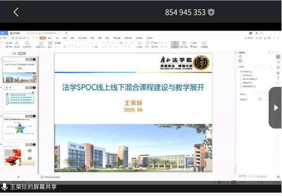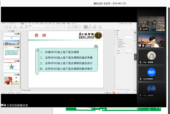 6月29日晚,sunbet申搏利用腾讯会议平台特邀广东外语外贸大学法学院王荣珍教授为全院师生开展了一次题为“法学SPOC线上线下混合课程建设与教学展开”的主题讲座。院长郑玉敏、副院长朱晓红、沈亚萍以及各系主任、专任教师以及部分学生代表参加了此次活动。