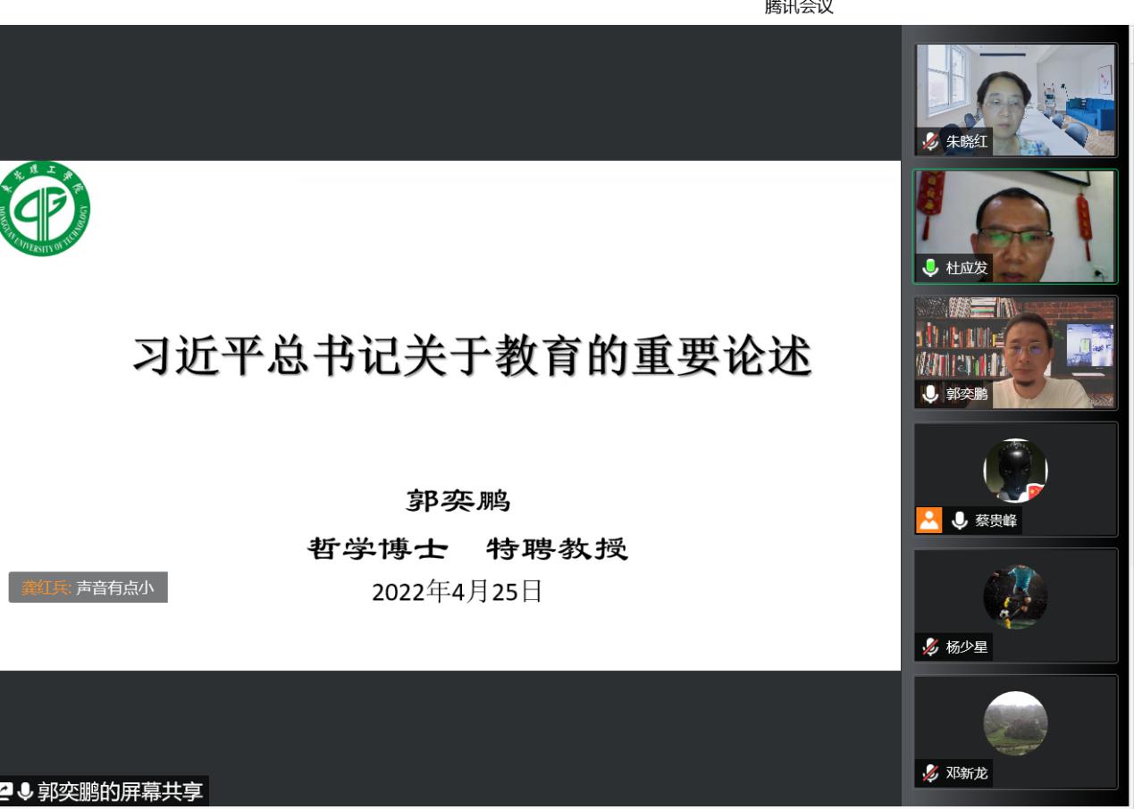4月25日晚,法律与社会工作学院(知识产权学院)党委邀请马克思主义学院党委副书记、特聘教授郭奕鹏为学院全体教师作“习近平总书记关于教育的重要论述”的专题讲座。会议由学院党委书记杜应发主持,sunbet申搏全体教师参会。会议采用线上直播的形式进行。