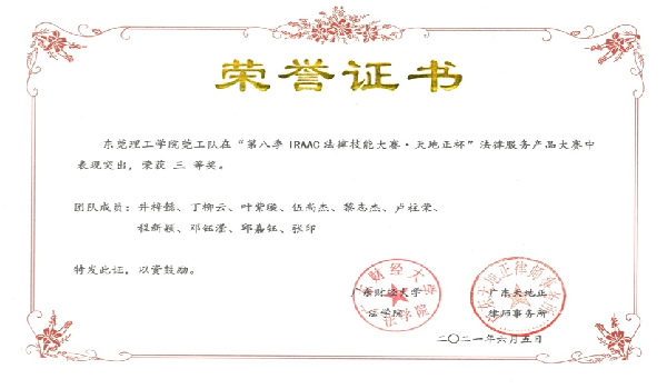 2021年6月5日上午,IRAAC第八季“天地正杯”法律技能大赛决赛落下帷幕。此次比赛的队伍包括来自华南师范大学、华南农业大学、广东外语外贸大学、广东工业大学、广东技术师范大学、广州大学、广东财经大学、广州大学及广东金融学院的共19支队伍。我校法律与社会工作学院(知识产权学院)学子初次参赛并在本次竞技中脱颖而出,历经初赛、决赛,终获赛事三等奖。