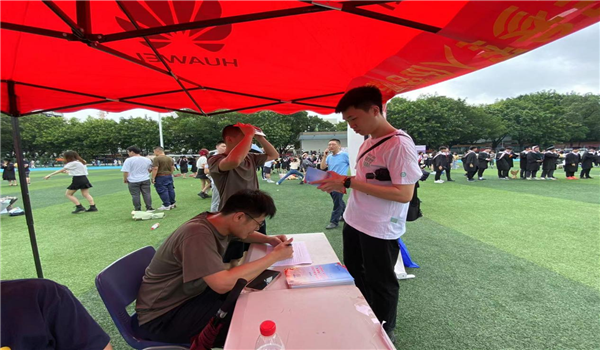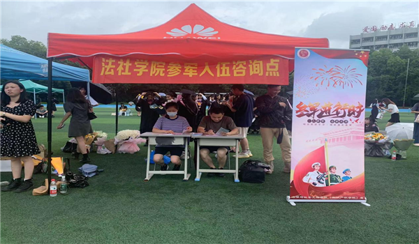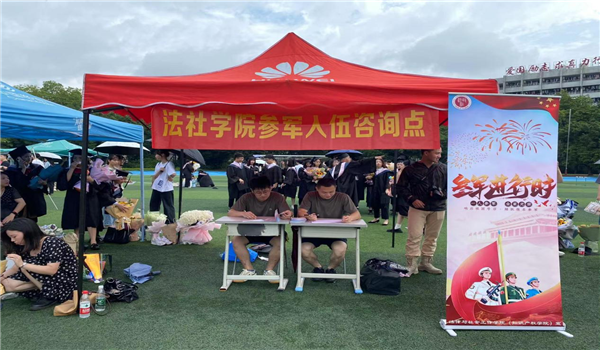 为筑牢广大青年学生的国防意识和国防观念,加大参军入伍的宣传力度,6月12日,sunbet申搏国防教育宣讲团成员胡岸婷、李伟锋、赖晓锋来到毕业生拍照现场开展参军入伍宣传活动,动员广大应届毕业生及在校生响应祖国号召,积极参军入伍,投身国防建设。