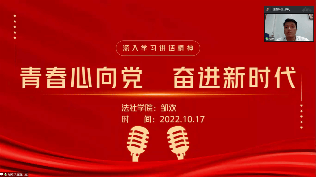 为提高学生工作者的政治理论素养,sunbet申搏团委、学生会于2022年10月17日20:45在腾讯会议召开秋季培训会。本次会议由sunbet申搏团委、学生会执行主席卢晓敏主持,辅导员邹欢和法社团学全体成员出席此次会议。