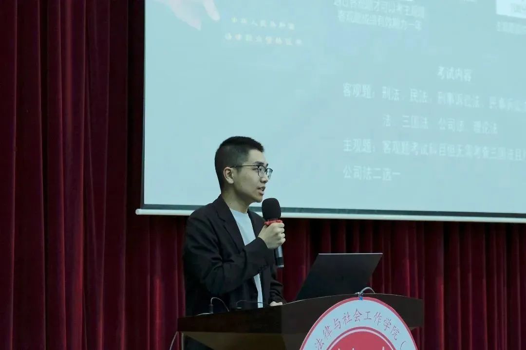 梁安源以“化作通变”为主题,强调大家身处于瞬息万变的时代,要做到思变、应变、转变,并结合他的校园、法考与实习经历,为同学们如何平衡好社团活动和学生工作与学习,现阶段如何为实习、工作、考研准备,如何挑选适合自己的实习公司等提出具体建议,着重分享了两条关于法考的锦囊妙计:备考法考的黄金时间;备考与专业课程的兼顾-融合式复习。建议同学们在高效利用校园时间,多参加学生活动,要有意识的提高资料检索能力、语言表达能力、团队协助能力。