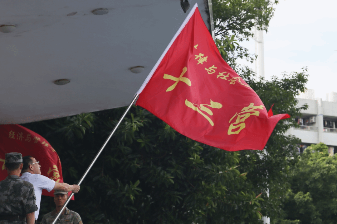 营旗猎猎,红旗飘飘,鼓动着新生们对军训生活的期待与向往,寄托着学校对于新生们勇往直前、不断奋进的殷切期盼,更承接着历届军训新生的热情与坚毅。相信法社学子定能不负期望,在接下来的军训生活中展示出法社英才的精神面貌,不负青春之我!在军训中不断成长进步,继往开来,追求卓越,引领未来!