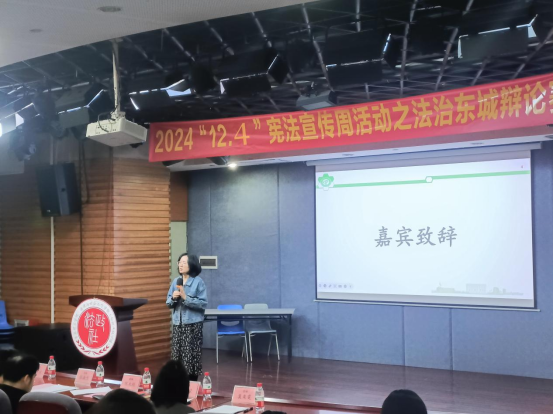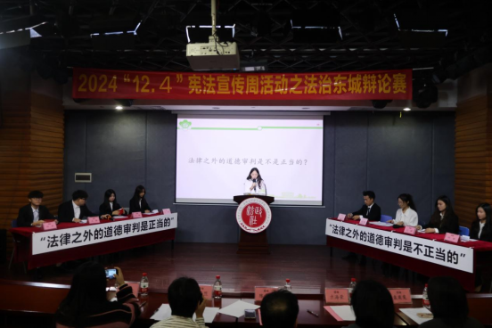此次辩论赛就“法律之外的道德审判是否正当”展开辩论。活动伊始,吉海荣老师致辞,回顾了与东莞市司法局东城分局在法治宣传和民主法治社区建设中的合作和创新,肯定了举办辩论赛对于法科学生能力和素质培养的重要意义,鼓励同学们以辩题为切入点做好学习和研究,训练逻辑思维和批判性思维,磨炼表达和论证能力,不断提升法科综合素养。