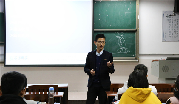 讲座开始,李溯师兄邀请唐老师上台分享有关考研的内容。唐老师通过生动有趣的语言,带领同学们深入了解考研。在讲到为什么要考研的时候,老师从导师、平台、就业能力以及人脉四个方面切入,并一一作出分析。他抓住在场同学对考研的疑惑和向往,用亲身事例引入话题,让全场观众豁然开朗。而后,老师为大家讲解应如何复习考研的内容,还重点讲了英语考试初试与复试中,大家普遍遇到的一些问题。最后还说,考研的目的就是为了在同届毕业生中让自己具备更大的竞争力,因为考研也是择优而选的原则,即使大家的初试分数达到复试的线,也未必能去复试,所以,同学们要更上一层楼。