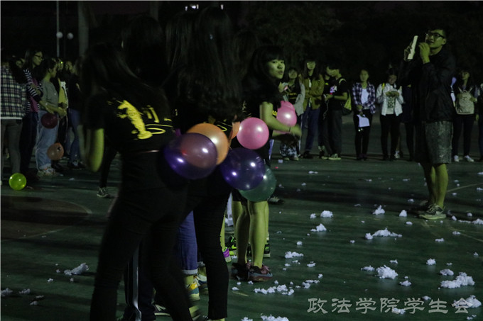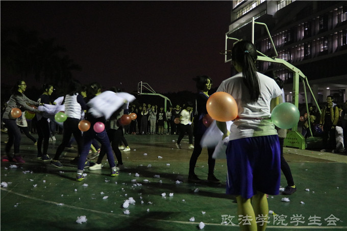 12月1日晚上八点,政法学院趣味比赛之枕头大战的决赛在莞城校区图书馆前篮球场举行。