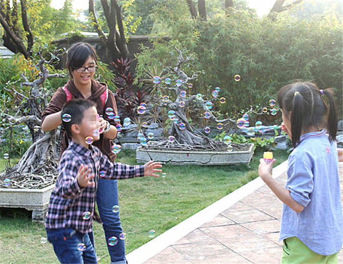 在“手拉手围大圈”和“翻烙饼”游戏等环节,可爱的小星星们笑靥如花,全身心投入到了游戏当中,他们身手敏捷,很快地完成任务并获得了奖励“泡泡水”一瓶。这些简单而有趣的游戏,既增进了志愿者们与星星孩子之间的友谊,也展现了家长与星星孩子互动的亲子关系。