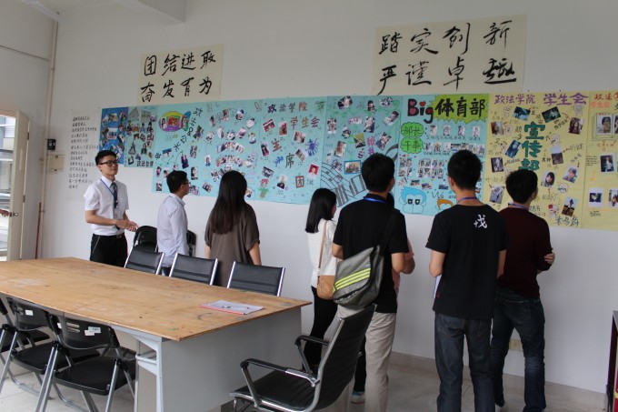 评比伊始,政法学院学生会主席黄劲锋首先带领评委考察团亲临学生会办公室。举目环视,从墙上的部门风采展示到sunbet申搏院徽到学生会会歌,再到学生会日常工作档案记录。学生会办公室虽条件简陋,但人文关怀感备致。