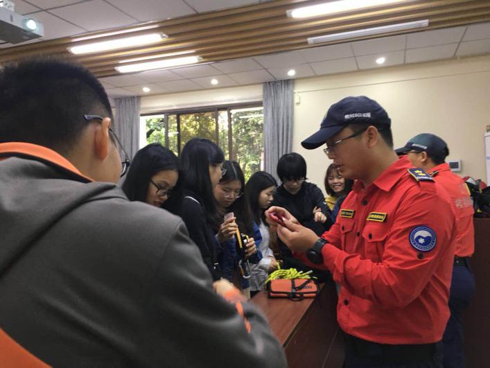5月7日上午,东莞市救援辅助协会肖进军秘书长和技术培训导师黎启波教练应主讲老师丁淑娟博士邀请来到课堂。黎教练重点结合实践中紧急救援案例和常用的医疗救援装备,特别分享了紧急救援的“生命链”:“识别和启动应急反应系统-即时高质量心脏复苏-快速除颤-基础及高缓急救医疗服务-高缓生命维持和骤停后护理”。基于东莞市的地区性暴雨自然灾害频发特点,肖秘书长主要为同学们介绍了水域装备(救援头盔、救生刀、抛绳包和救生衣等)。在教练的指导下,同学们在愉快的互动气氛中体验了抛绳、救生衣、打绳结等救援装备或技巧。最后,两位专家特别强调大学生应该特别重视应急自救,保持镇静不要惊慌,不盲目地行动,选择正确的救助方法。本次实务专家进课堂极大丰富了实践教学效果,有利于增强学生危机预防和应对能力。