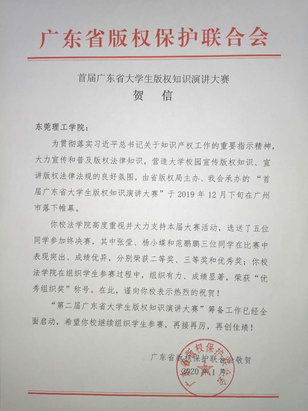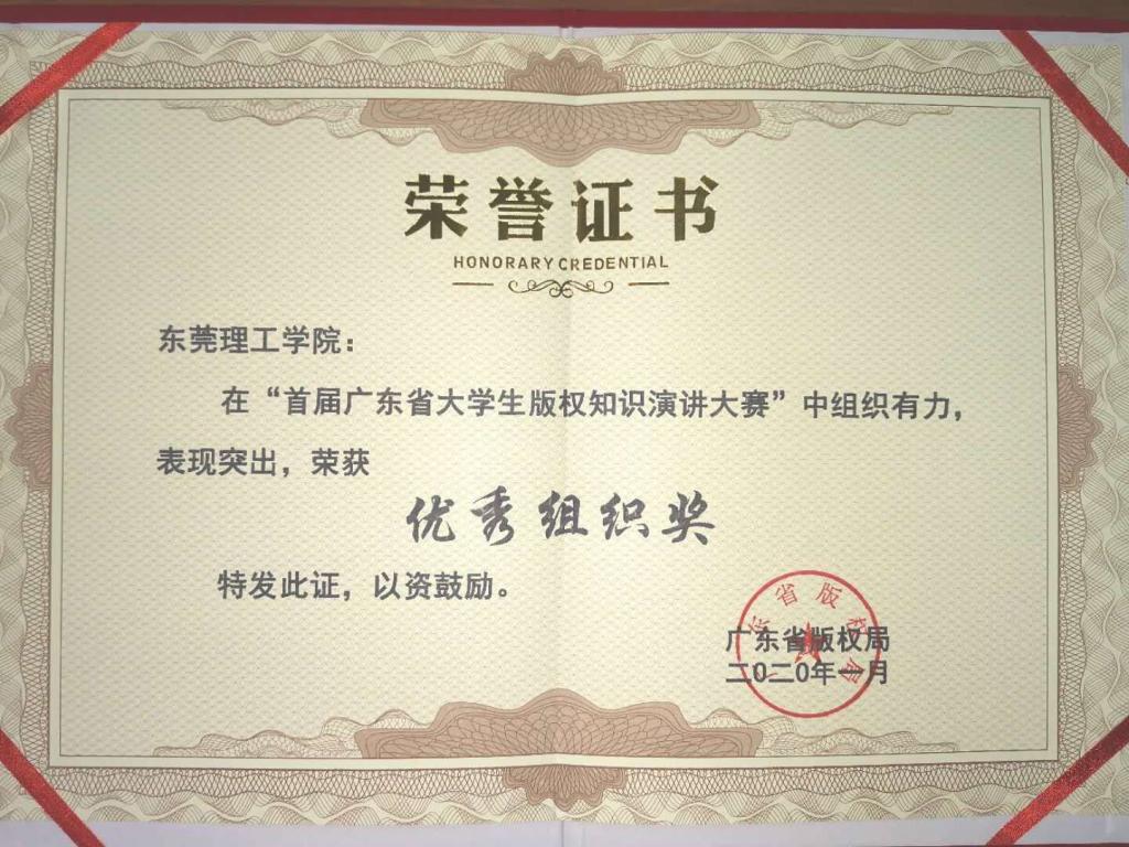 近日,“首届广东省大学生版权知识演讲大赛”所有奖项敲定。sunbet申搏不负众望,勇夺“优秀组织奖”荣誉并收到广东省版权保护联合会发来的贺信。