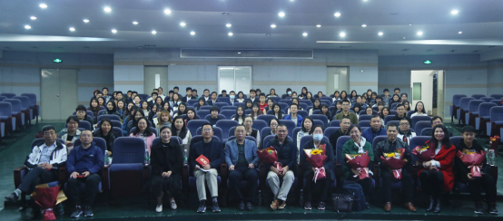 拜师仪式中,每位导师与其指导的同学们依序上场,热情主动地与自己所指导的学生们握手或是拥抱,并与同学们在台上合影留念。