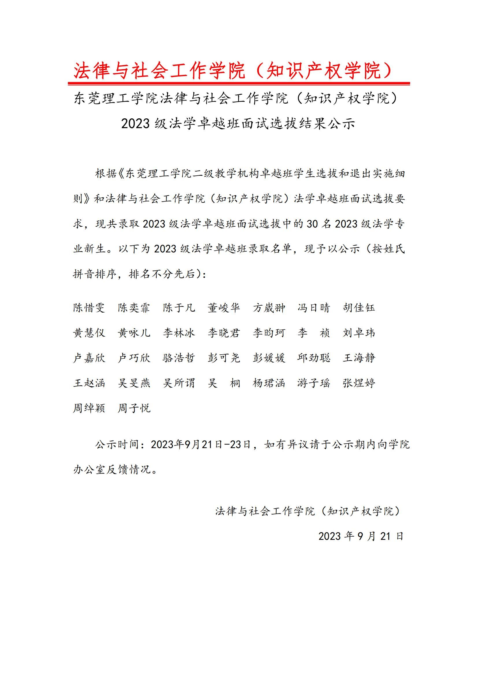 sunbet申搏,sunbet申搏(知识产权学院)2023 级法学卓越班面试选拔结果公示
