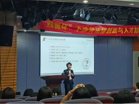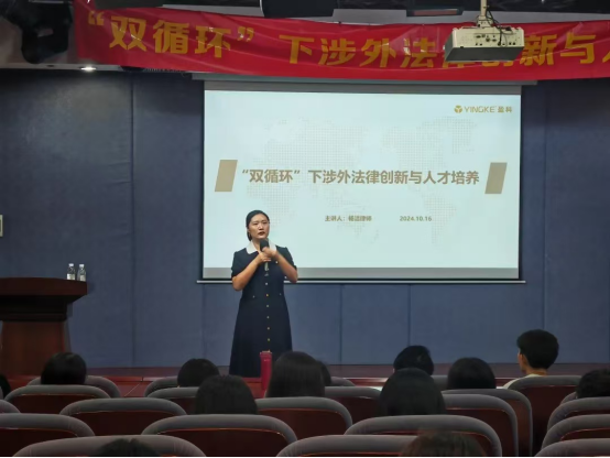讲座中,杨洁律师首先通过对话的方式,从主题出发,结合自身的经历,与同学们深入地剖析了在当前的社会发展趋势下,涉外法律服务的新趋势和涉外专业人才培养的重点。她提到,目前主要的涉外法律服务领域包括跨境电商、全球商贸、国际税务、国际工程、企业出海,以及出口管制、双反、337调查和反垄断等。