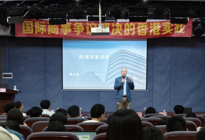 随后,讲座主讲人黎子健大律师以生动幽默的语言,为大家带来了精彩纷呈的演讲。黎律师自2007年起在香港担任私人执业大律师,对跨境商事调解有着深入的研究和独到的见解。在讲座中,黎子健律师详细阐述了跨境商事争议的三种主要解决途径:国际商事调解、国际仲裁和诉讼。他通过对这三种途径的对比分析、对以往案例的讲述,结合现场举例等生动有趣的方式,讲解商事争议解决路径,指出了三种途径各自的优势和局限。