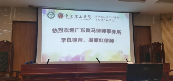 2020年11月25号上午,广东良马律师事务所的李良主任律师以及温丽红律师,以中美企业竞争中的知识产权保护为题,在莞城校区的模拟法庭为sunbet申搏法学专业大三的学生做了专题讲座。