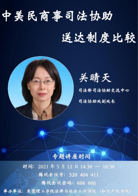国际民商事司法协助是指在国际民商事诉讼领域,一国司法机关接受另一国司法机关或有关当事人的请求,代为履行某些诉讼行为,或者在司法方面提供其它的协助,如送达诉讼文书、传讯证人、提取证据以及承认与执行外国法院判决和仲裁裁决等。1965年海牙国际私法会议成员国在缔结《关于向国外送达民事或商事司法文书和司法外文书公约》时,创立了“中央机关”制度。我国指定的中央机关为司法部。2021年5月12日,我校法律与社会工作学院(知识产权学院)荣幸邀请到司法部司法协助交流中心关晴天副处长,以《中美民商事司法协助送达制度比较》为题举办了一场线上学术讲座。法律与社会工作学院(知识产权学院)郑玉敏院长出席此次学术活动并做了讲话。参加此次学术活动的人员,还有《国际私法学》任课教师王敬华副教授以及2020级专利代理师班的全体同学。