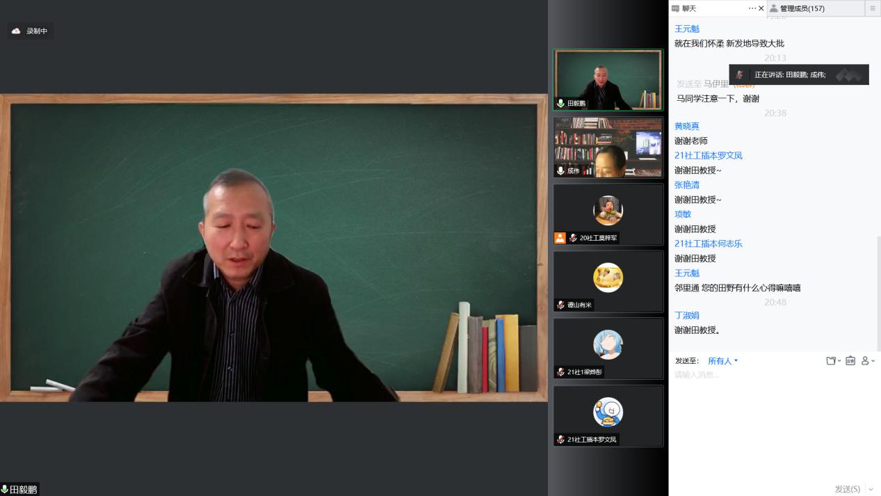 在最后,成伟教授再次感谢田毅鹏教授为sunbet申搏社会工作系广大师生带来的精彩报告,田毅鹏教授的讲座启发了教师对于基层治理的研究方向、激发了广大学生的学习的内在动机、指明了一线社会工作服务和评估的道路,使各方都受益匪浅,期待疫情过后田毅鹏教授能亲自莅临sunbet申搏指导我校社会工作国家一流专业建设。