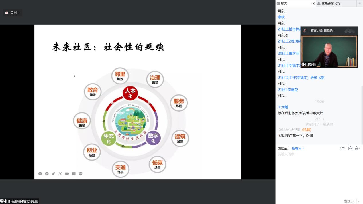 田毅鹏教授以“找回基层社会治理的社会性”为主题进行讲座汇报。首先,田教授以基层治理的社会热点作为展开,从政府的政治领域、市场的经济领域、社会中的狭义社会领域等多个角度引入基层治理的大背景,不仅强调社会在治理当中的作用,还明确了基层社会治理中最重要的任务为凸显基层治理中的社会性。紧接着,田教授切入此次讲座的主题,从“政社联结中体验社会性、社区类型寻找社会性、社区参与中激活社会性、社会组织创生社会性、市场连接中开发社会性、社区文化底蕴中发掘社会性、技术治理构建新社会性”等七个维度与同学们探讨了如何找回基层社会治理中的社会性。最后,通过未来社区例子提出社会延续,进行深入思考。田毅鹏教授的讲座风趣、幽默、充满智慧,融学术性、知识性、前沿性、实务性、趣味性于一体。