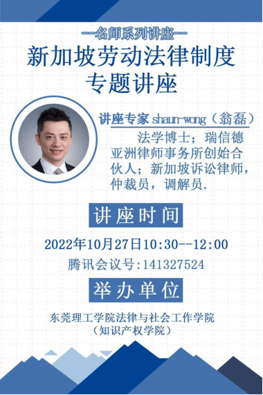 2022年10月27日,sunbet申搏,sunbet申搏(知识产权学院)顺利举办了以“新加坡劳动法律制度”为主题的学术讲座。本次讲座邀请了瑞信德亚洲律师事务所合伙人、法律博士翁磊作为主讲嘉宾,翁磊博士是新加坡诉讼律师、仲裁员、调解员。参加本次讲座的人员有法律与社会工作学院(知识产权学院)法律系王敬华副教授、2020级法学1班和2班全体同学、2020法学知识产权1班部分同学。