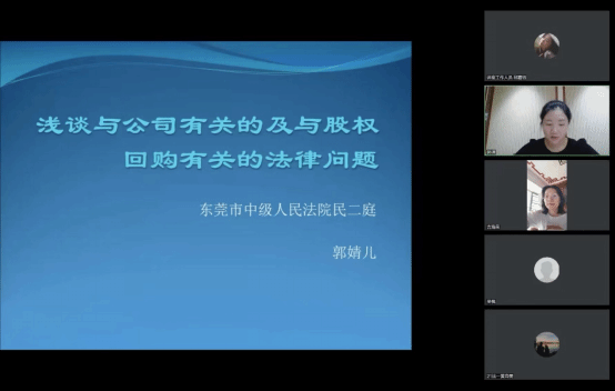 11月14日下午,法律与社会工作学院(知识产权学院)法律系于腾讯会议举办第二十二期法路历程讲座:浅谈与公司有关的及与股权回购有关的法律问题讲座。本次讲座邀请了东莞中院四级高级法官、民二庭负责人郭婧儿法官担任主讲人。本次讲座由法律系副主任吉海荣主持。