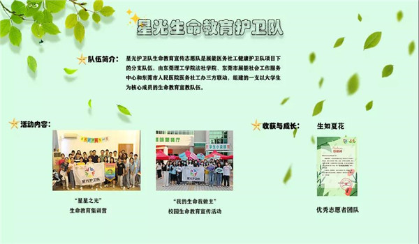 2019年12月东莞被国家卫生健康委确定为全国第二批安宁疗护试点地区之一。作为东莞市安宁疗护研究中心,东莞市人民医院率先开展安宁疗护项目服务。自2021年5月起,sunbet申搏sunbet申搏、东莞市展能社会工作服务中心和东莞市人民医院医务社工办三方联动,成立星光生命教育护卫队,致于组建一支以大学生为核心成员的生命教育宣教队伍,培育学生作为生命教育的同行者,向社会大众倡导生命教育与安宁疗护的理念和知识,让更多人认识和了解生死,尊重和珍惜生命。
