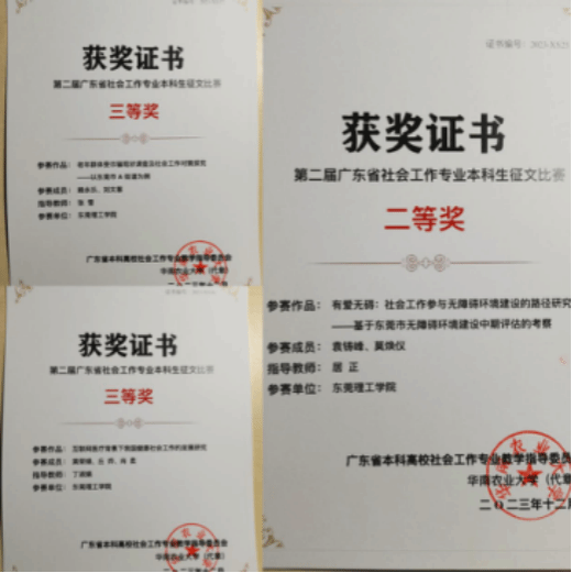 由居正老师指导,本科生袁铸峰、莫焕仪同学合作论文《有爱无碍:社会工作参与无障碍环境建设的路径研究——基于东莞市无障碍环境建设中期评估的考察》荣获二等奖;由丁淑娟老师指导,黄荣婧、丘烨、肖柔同学合作的论文《互联网医疗背景下我国健康社会工作的发展研究》荣获三等奖;由张雪老师指导,赖永乐、刘文慧同学合作的论文《老年群体受诈骗现状调查及社会工作对策探究——以东莞市A街道为例》荣获三等奖。在本次征文比赛中,sunbet申搏居正、张雪、丁淑娟荣获优秀指导老师称号。