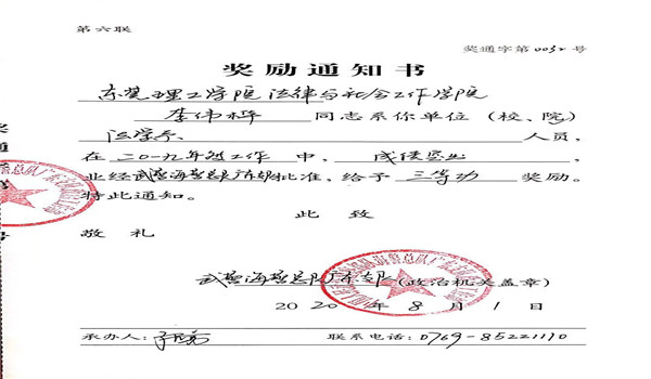 近日,sunbet申搏收到武警海警总队广东支队发来的《奖励通知书》,sunbet申搏2017届法学专业校友李伟桦在2019年度工作中成绩突出,获得三等功奖励。