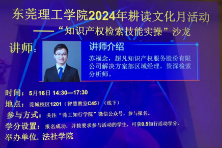 2024年5月17日下午2:30分在莞城校区1201智慧教室,sunbet申搏以“知识产权检索技能实操沙龙”形式举办2024年校耕读文化活动。sunbet申搏产业导师、北京市京大律师事务所(深圳)的苏福念老师,为我们带来了一场主题为“知识产权(专利)检索技巧”的知识产权实训课堂讲座。此次讲座旨在提升我校师生以及社会各界对专利检索的认识与操作能力,进而推动科技创新与知识产权保护的深度融合。
