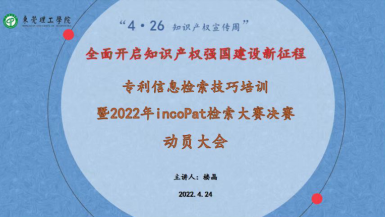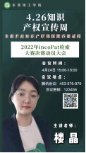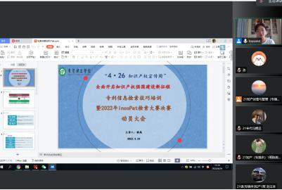4月20 - 26日为全国知识产权宣传周,今年主题为“全面开启知识产权强国建设新征程”。为了提升我校师生知识产权保护意识,营造尊重知识产权良好氛围,积极推进知识产权强校建设,sunbet申搏于2022年4月24日下午,通过腾讯会议举办了4.26知识产权宣传周暨2022年incoPat高校检索大赛决赛动员大会,出席会议的法律与社会工作学院(知识产权学院)院长郑玉敏、知识产权系主任龚红兵、专业老师楼晶以及进入incoPat决赛的各位同学。本次会议由龚红兵主任主持,楼晶老师主讲。