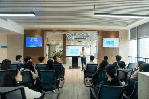 (文言总经理于公司大厅为学生讲授公司团队的运营模式)